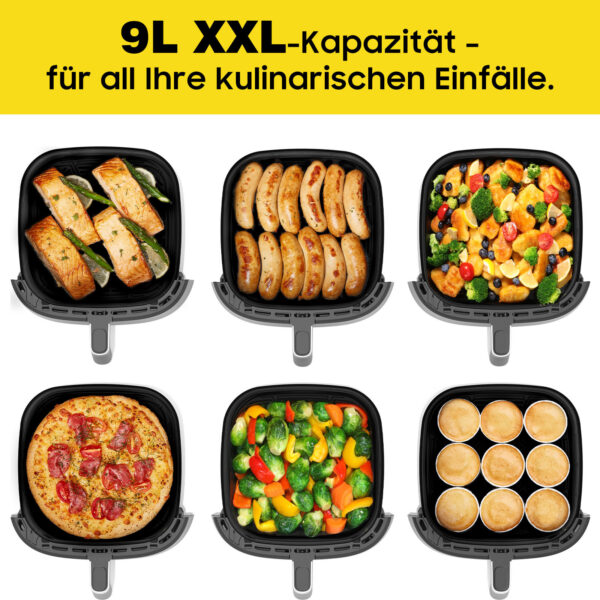 1500 W, met 12 kookprogramma’s, temperatuurbereik van 80-200 °C, anti-aanbaklaag, timer, vaatwasmachinebestendig, en geschikt voor grillen, bakken en dehydrateren zonder olie of vet