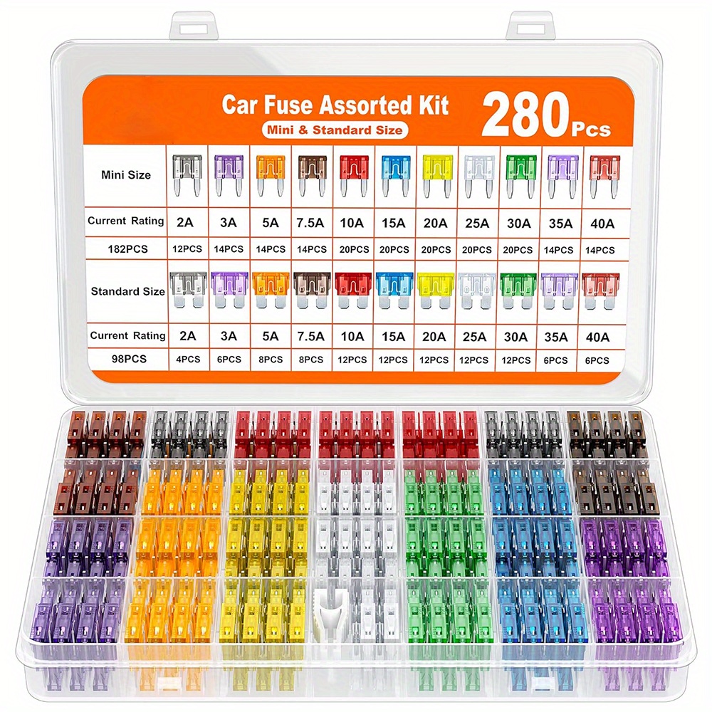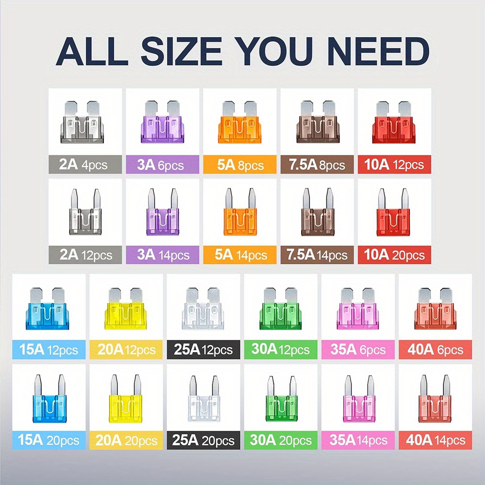 1. Meet all your needed size — The car fuses assortment kit includes 182pcs mini fuses and 98pcs standard fuse kit. Two styles of automotive fuses have 11 current specifications (2A /3A / 5A/ 7.5A/ 10A/ 15A/ 20A/ 25A / 30A/ 35A/40A), equipped with a fuse puller.
