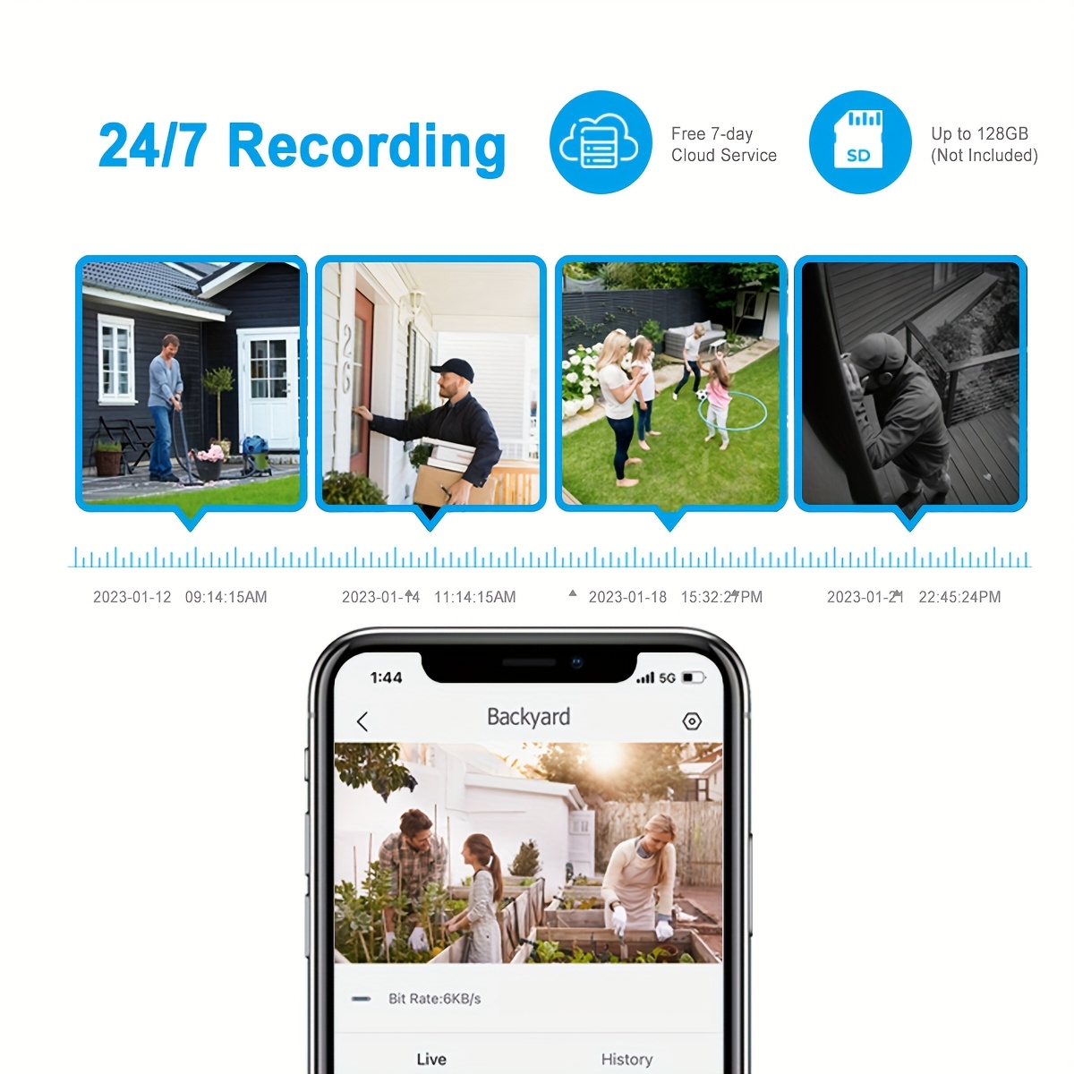 Makkelijk te installeren en energiebesparend: de camera staat in slaapstand om stroom te besparen in normale tijden. Wanneer beweging wordt gedetecteerd, wordt de camera onmiddellijk wakker en wordt een waarschuwingsbericht naar uw app verzonden. U kunt ook cameralarmen instellen om ongewenste personen af te schrikken