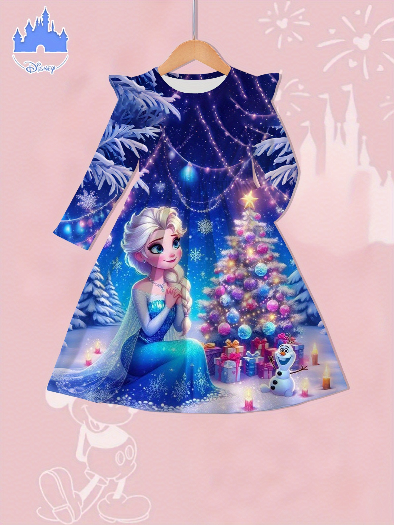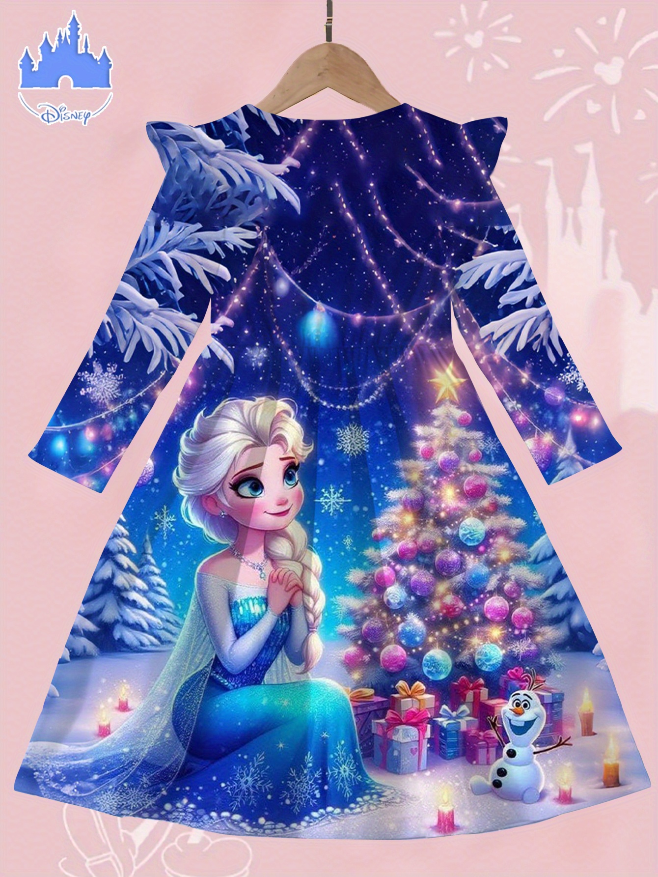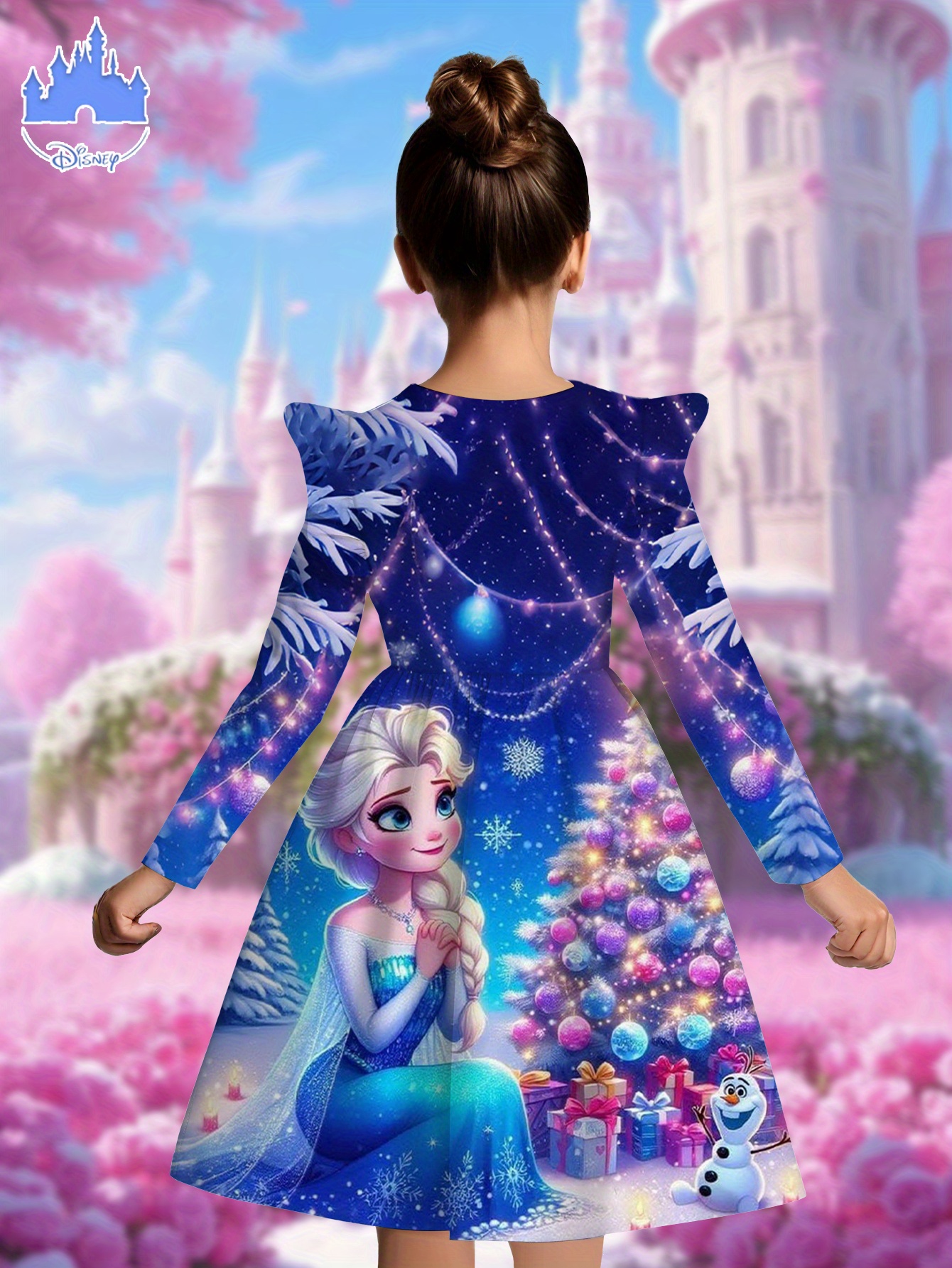 Disney Elsa-Geïnspireerde Meisjesjurk met Lange Mouwen en Sneeuwvlok & Boomprint – Zacht Polyester, Ronde Hals, Perfect voor Buitenspelen