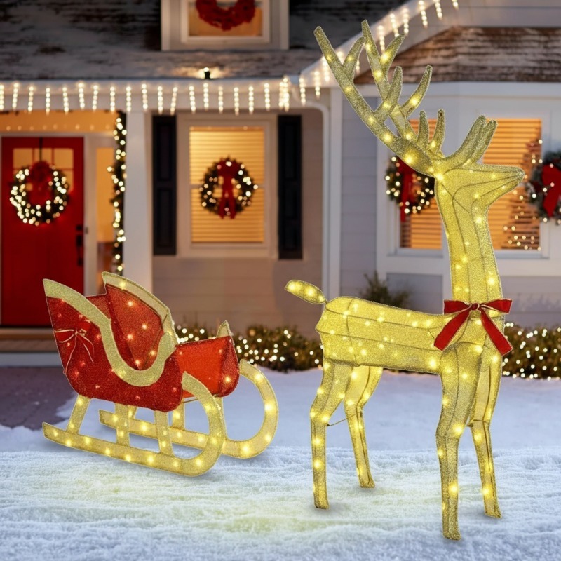 Kleur: Warm Witte Afmetingen: 70 x 26 x 128.5 cm (L x B x H) Versierd met rood lint Inclusie: 1 x Rendier trekt slee Montage vereist: Ja