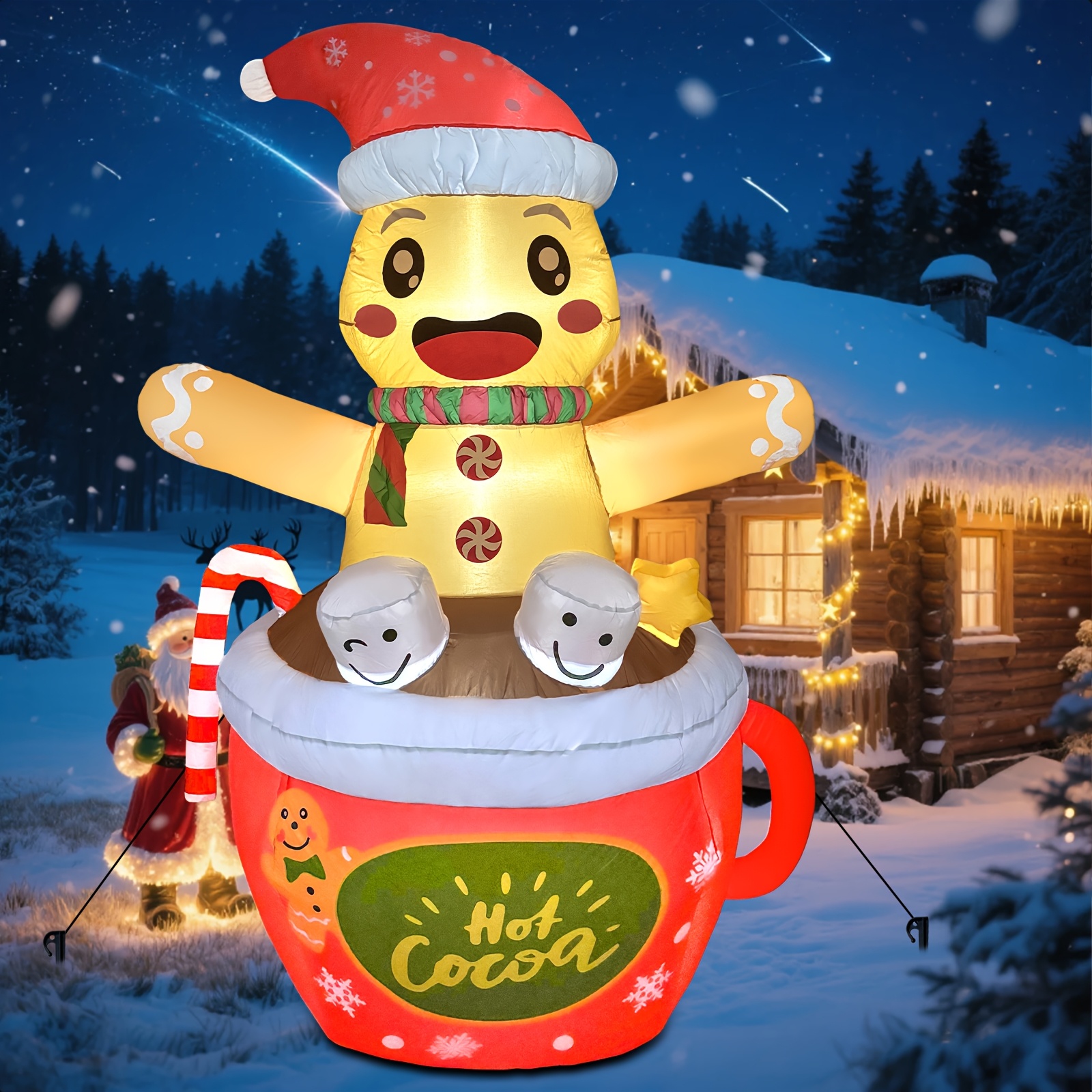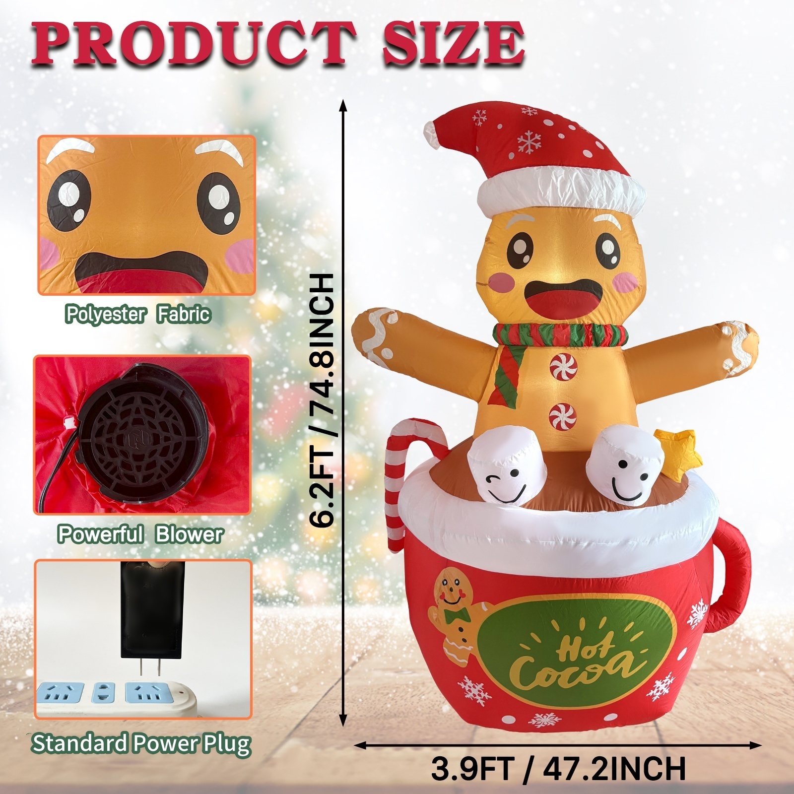 188,98 cm Kerst Gemberkoek Opblaasbare Decoratie voor Buiten, Opgeblazen Gemberkoek met LED-verlichting in Warme Chocolademelk Mok en Pepernoot