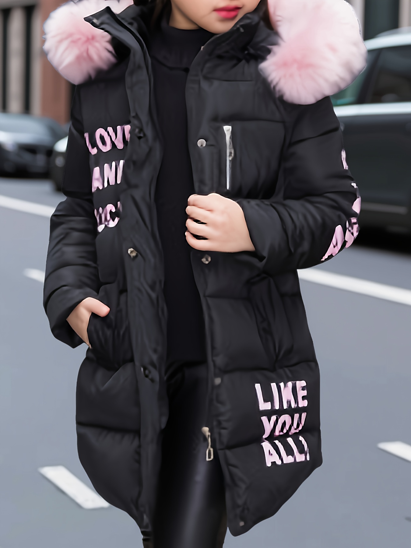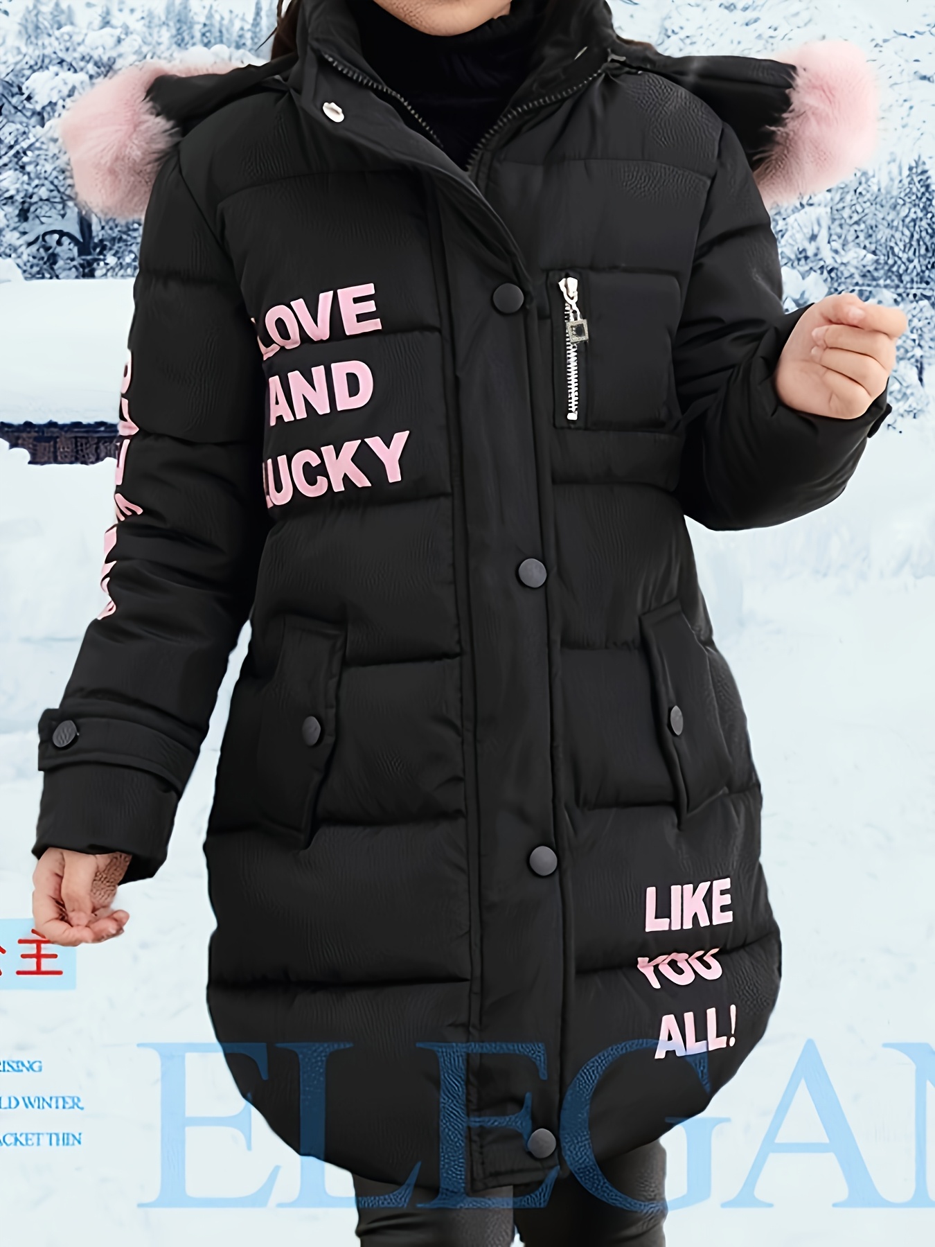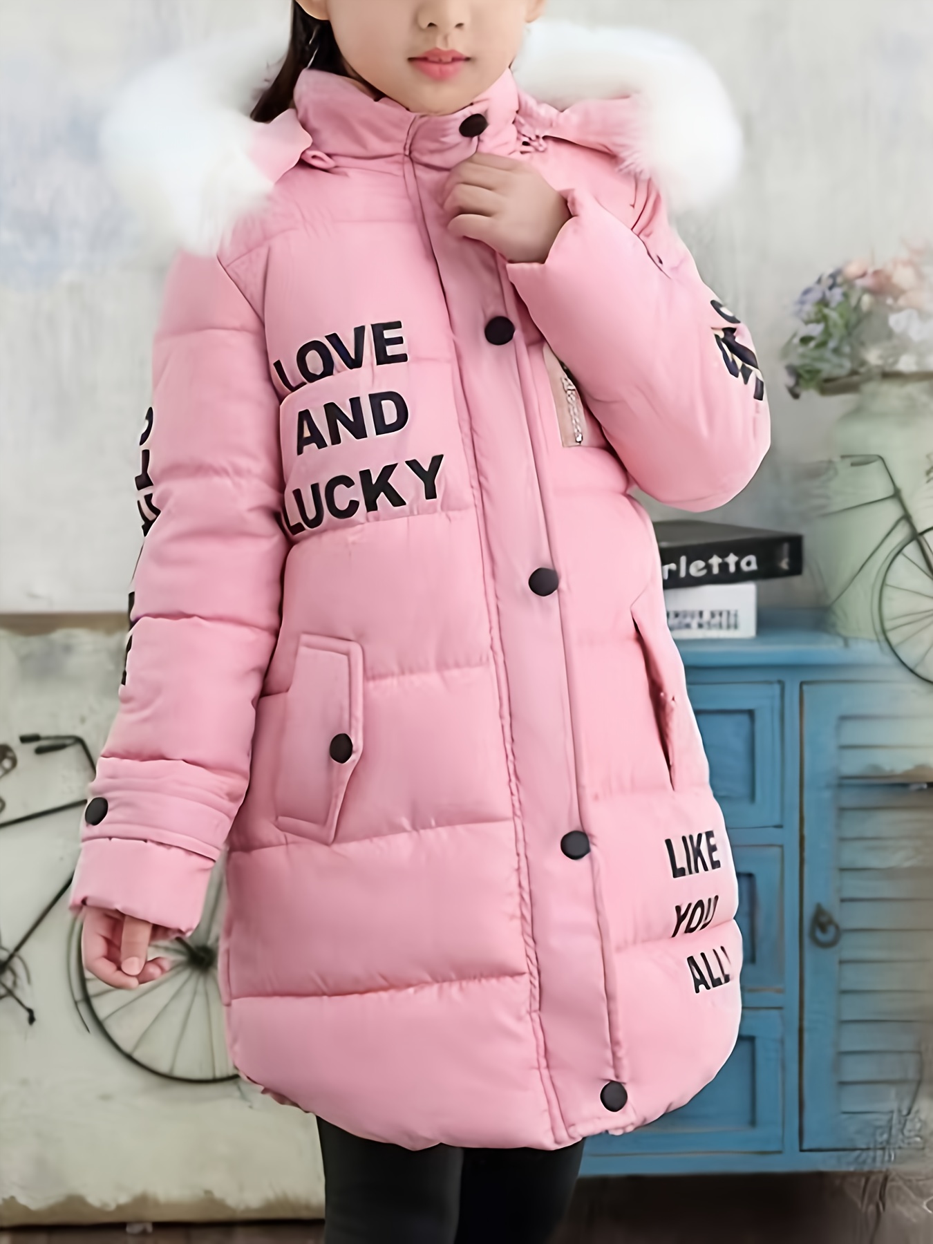 Stijlvolle Roze Lange Capuchonjas voor Dames met “LIEFDE EN GELUKKIG” Opdruk